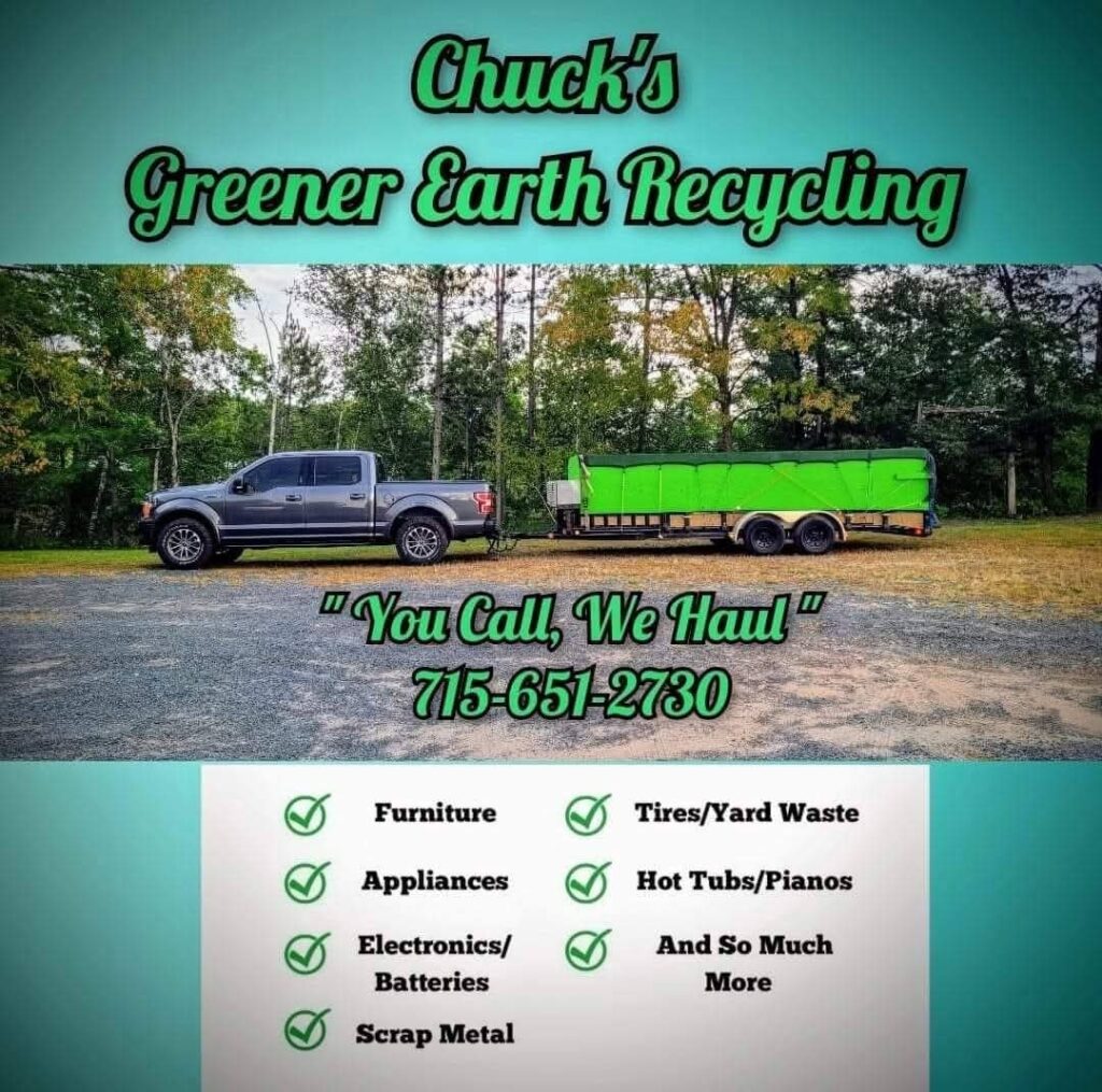 Thanks to Chuck’s Greener Earth Recycling for helping keep our roadways clean! Call or text 715-651-2730 if you need help disposing of unwanted items, large or small.