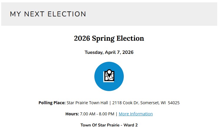 Confirm your voting ward and other voter information through MyVote.WI.gov using the My Voter Info tab at the top. This will also confirm your next scheduled election. For example: